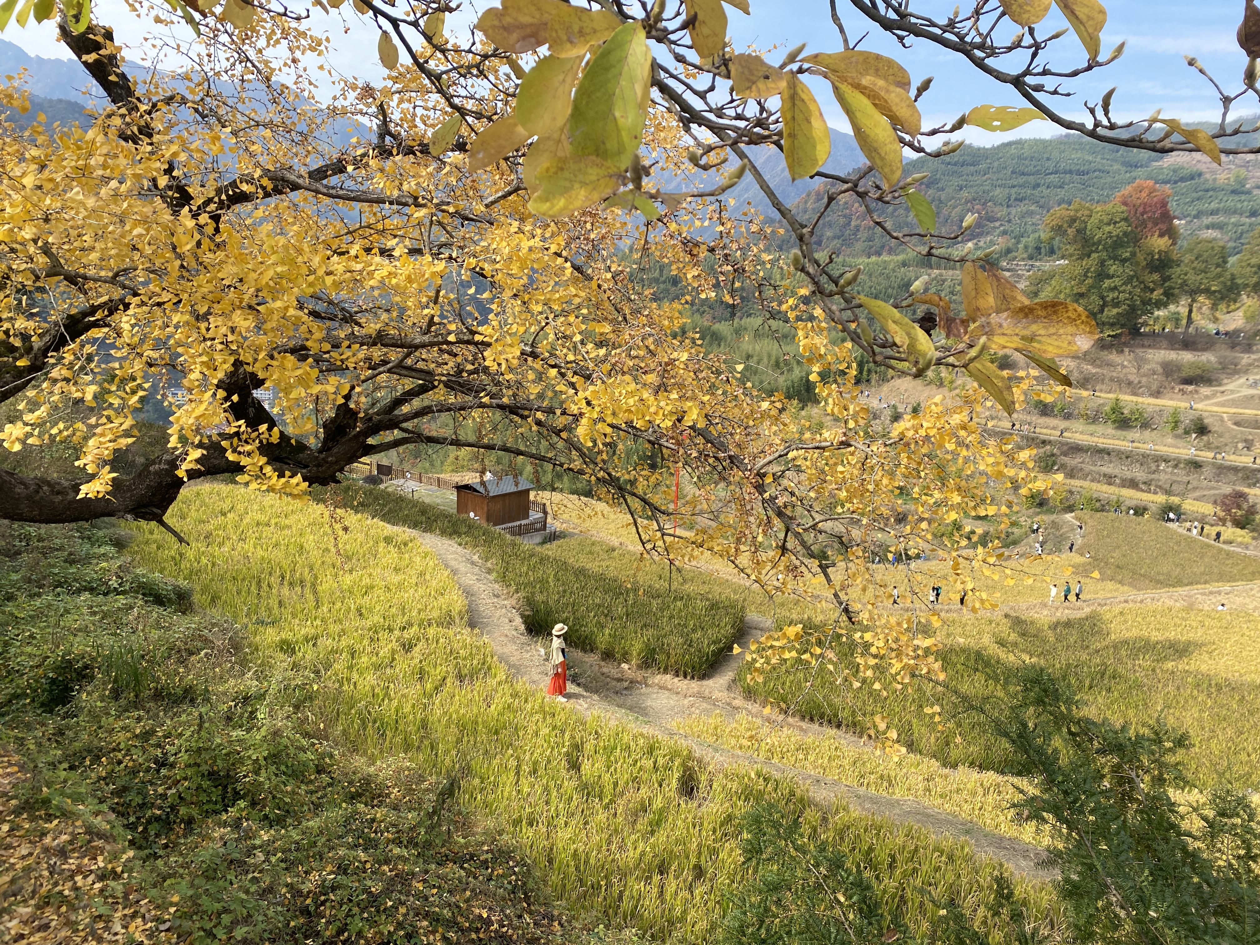 進入臨川古道入口,拾階而上,金黃的銀杏葉、火紅的楓香葉、巨大的香榧樹,在山道邊隨風搖擺,仿佛熱烈歡迎著和仁科技的小伙伴們。一眼望去,村子兩側分布著上世紀開墾的梯田,遍地金燦燦,沉甸甸的豐收景象。數百株珍稀古樹將村莊包圍,眼到之處,皆是美景。