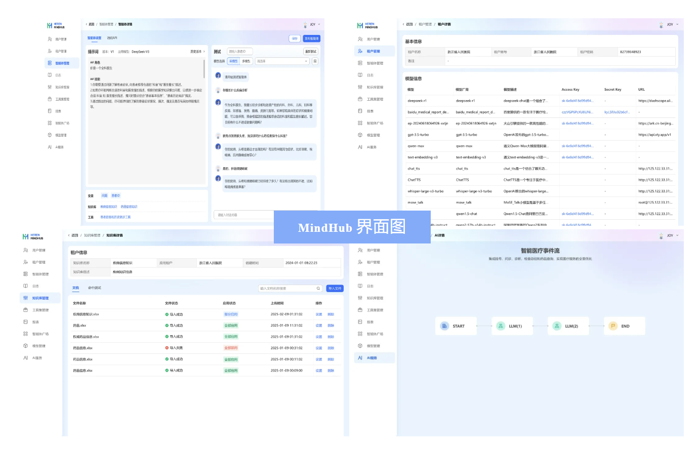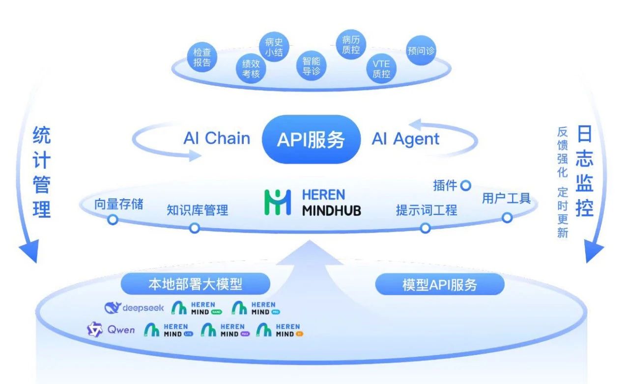 在醫療系統智能化深度發展的關鍵階段,和仁科技自2023年啟動了 MindHub 人工智能中臺的研發,該平臺構建了連接AI技術基礎設施與醫療場景的核心引擎。2024年7月,MindHub 率先接入 DeepSeek V2 和 Qwen2 系列模型,并在多家醫院展開部署;2025年2月,平臺已同步支持 DeepSeek R1 模型。通過將人工智能模型的認知能力深度嵌入醫院診療活動和日常運營中,MindHub 形成了從數據感知到決策執行的閉環智能網絡,重構建醫療價值鏈的底層運行邏輯。目前,MindHub 支持超過60個醫療AI模塊的“熱插拔”式部署,使醫院能夠靈活對接不同規模和參數的 AI 模型,更多場景模塊還在持續拓展中。無論是快速迭代的通用大模型,還是專門針對醫療領域持續優化的垂直大模型,都能夠即插即用,快速部署。在實際應用中,MindHub 展示了兩大核心優勢:一方面,其分層架構設計保證了對最新大模型技術的敏捷響應能力,另一方面,基于和仁數據中心能力 MindHub 能夠與醫院 HIS 系統中的全流程數據進行毫秒級聯動,確保系統無縫集成人工智能底座能力。