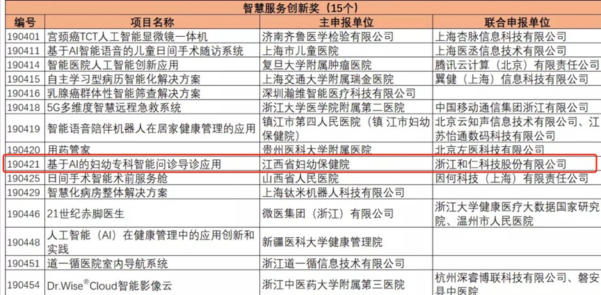 11月12日,由國家衛生健康委員會醫院管理研究所指導、《中國數字醫學》雜志社主辦的“2019全國醫療人工智能創新獎”的評選活動中,由浙江和仁科技股份有限公司(以下簡稱“和仁科技”)和江西省婦幼保健院聯合申報的“基于AI的婦幼??浦悄軉栐\導診應用”榮獲智慧服務創新獎。